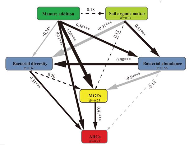 图3结构方程模型(SEM)阐明了粪肥添加、土壤有机质、细菌多样性、细菌丰度和MGEs对ARGs的直接和间接作用
