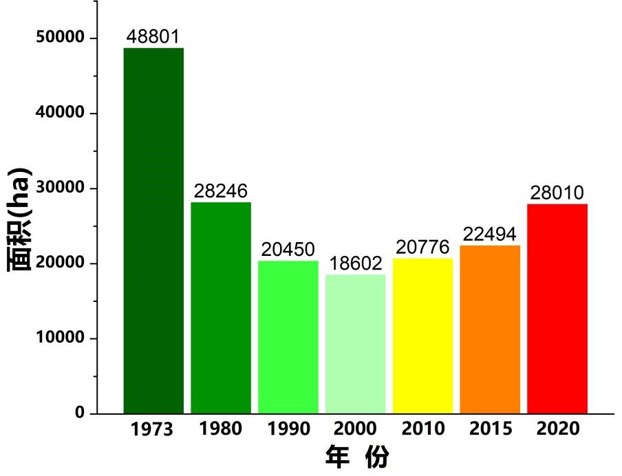研究表明,近50年中国红树林面积先减少后增加,如图2所示。其中1973-2000年中国红树林减少了30199 ha,约62%的红树林消失;2000-2020年红树林面积增加9408 ha,增长51%。2020年中国红树林的总面积基本恢复到1980年水平。