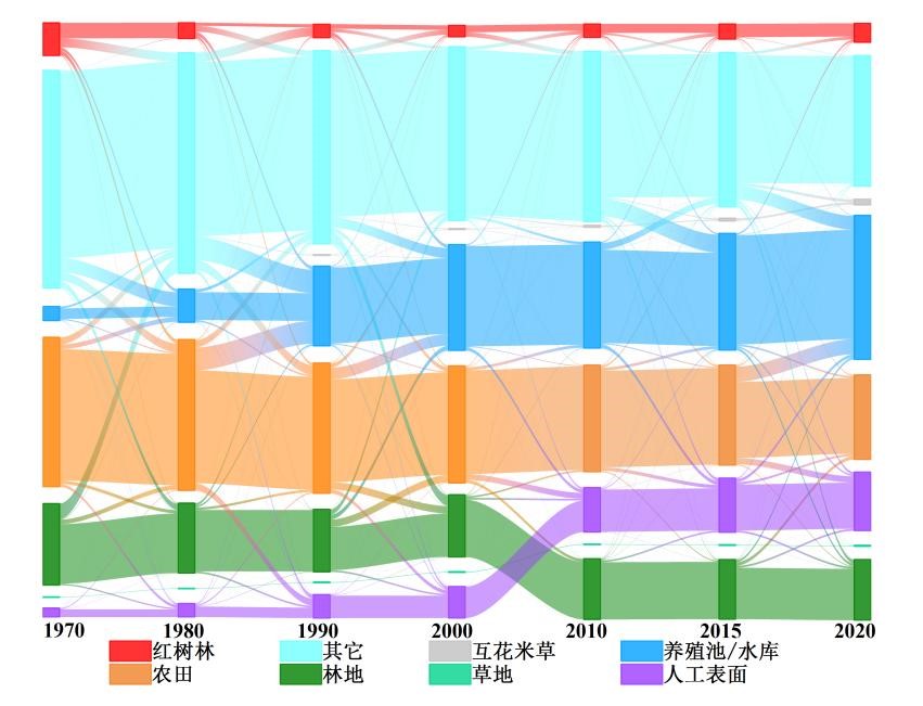 图3. 1973-2020年红树林生长区土地覆盖类型相互转化