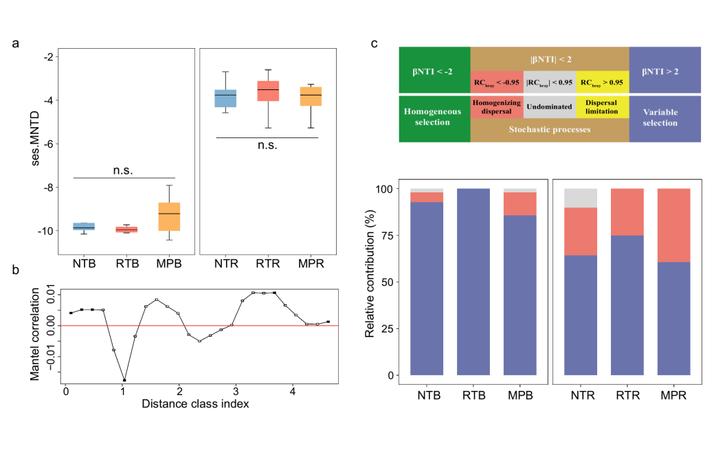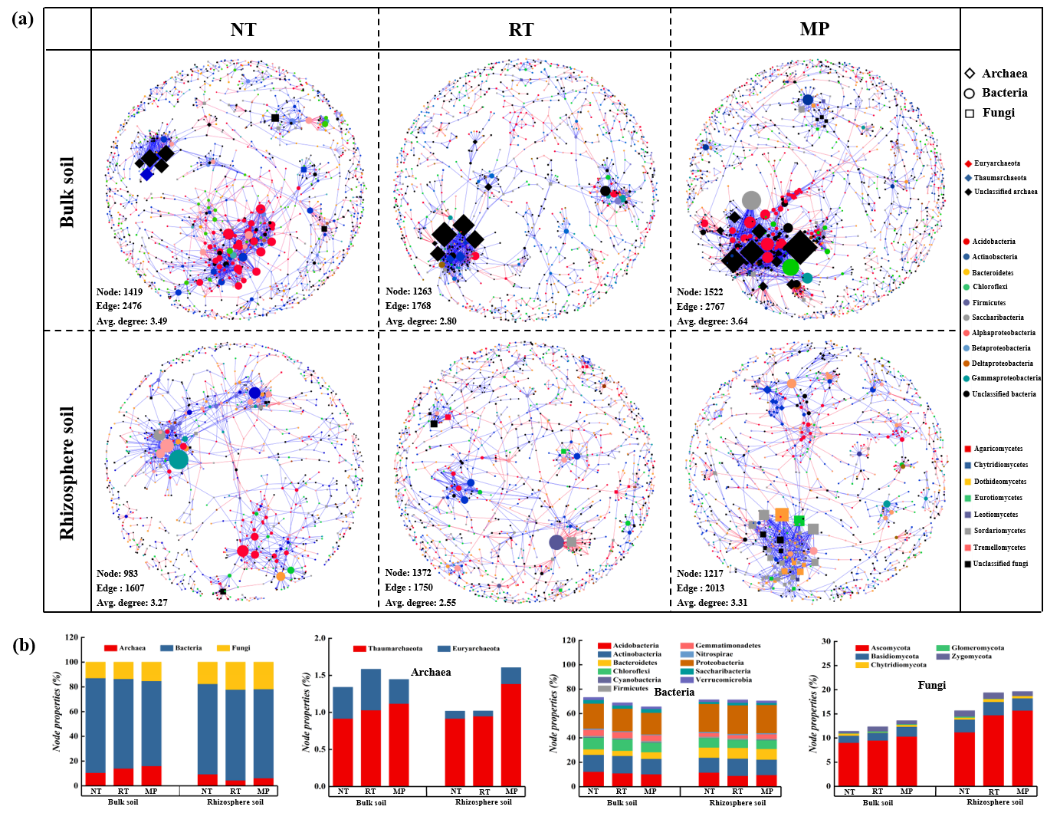 东北地理与农业生态研究所农田分子生态学科组和黑土有机碳与保护性耕作学科组,对免耕(NT)、少耕(RT)和传统耕作(MP)处理下土壤微生物群落组成、装配过程和分子网络结构进行解析,探讨了保护性耕作下黑土农田土壤微生物群落结构演替及发生机制对土壤质量和作物生产力的影响。研究结果表明,不同耕作方式显著改变了根际和非根际土壤微生物群落,与传统耕作MP相比,保护性耕作NT和RT显著增加了硝化菌Nitrosospira sp.和固氮菌Mesorhizobium sp., Bradyrhizobium sp.和Burkholderia sp.相对丰度,但降低了具有有机质物分解功能的Blastococcus sp., Streptomyces sp.和Sphingomonas sp.相对丰度。网络分析和随机森林分析发现,上述功能菌在NT和RT处理中被注释为关键物种(keystone taxa),这表明保护性耕作更有助于土壤碳固定,并促进土壤的生物固氮和硝化作用(图1)。
