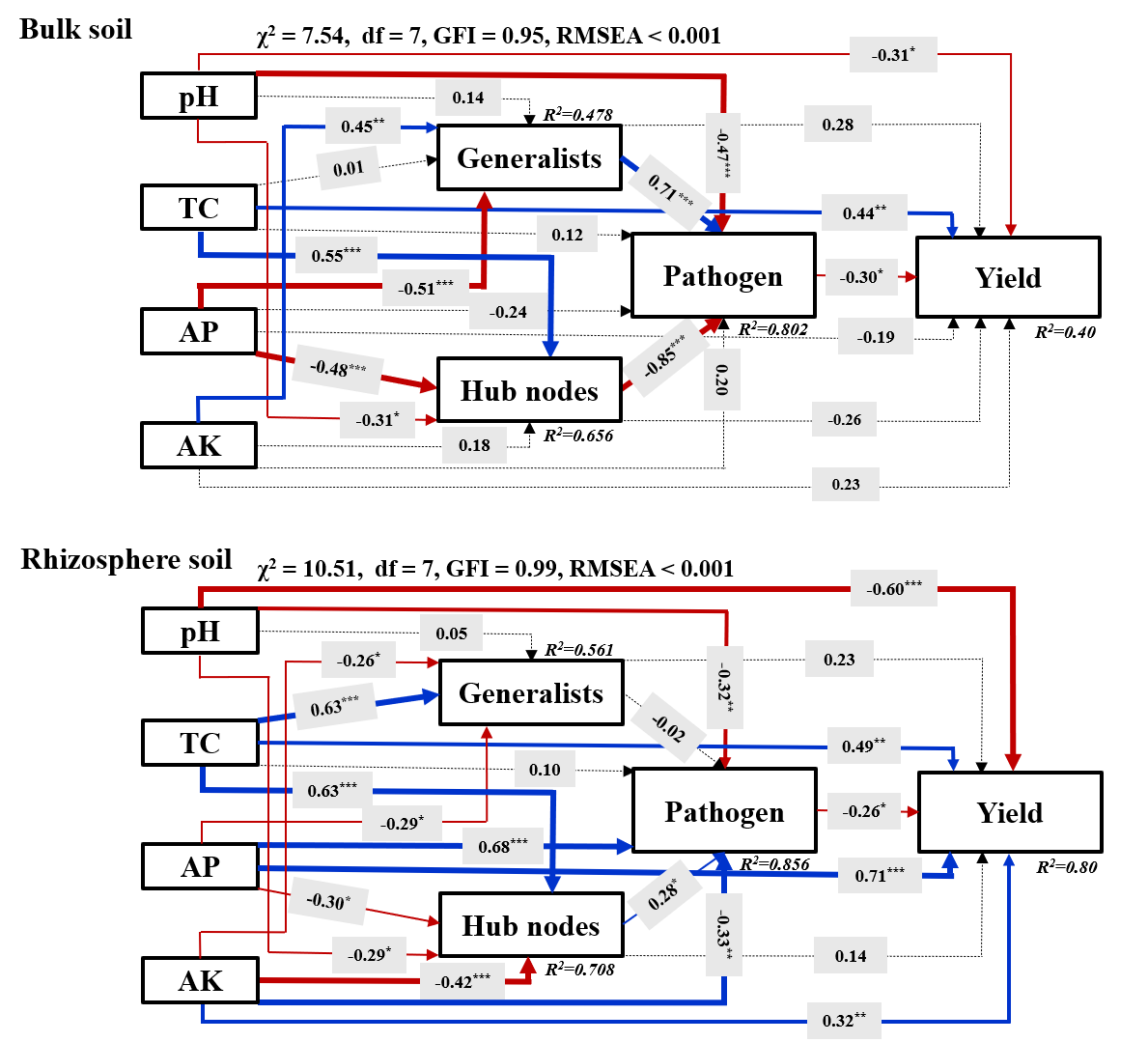 耕作方式显著改变了土壤微生物群落的装配过程。MP处理下细菌群落装配的随机过程,特别是同质性扩散(homogenizing dispersal),显著高于NT和RT,这可能是由于MP较强的土壤扰动,导致微生物的扩散速率增加(图2)。微生物分子生态网络表明,RT较NT和MP形成更稳定的网络结构,且RT有助于提高关键物种(keystone taxa)介导的土壤养分有效性,缓解植物病原菌的生态风险,而MP网络中的核心物种大多为潜在的植物病原菌。结构方差模型(SEM)分析结果显示,MP处理引起潜在病原微生物及相互间正向关联性作用,而RT处理具有较稳定的微生物网络结构,无效的病原菌传播路径减少,导致RT产量高于MP(图3)。