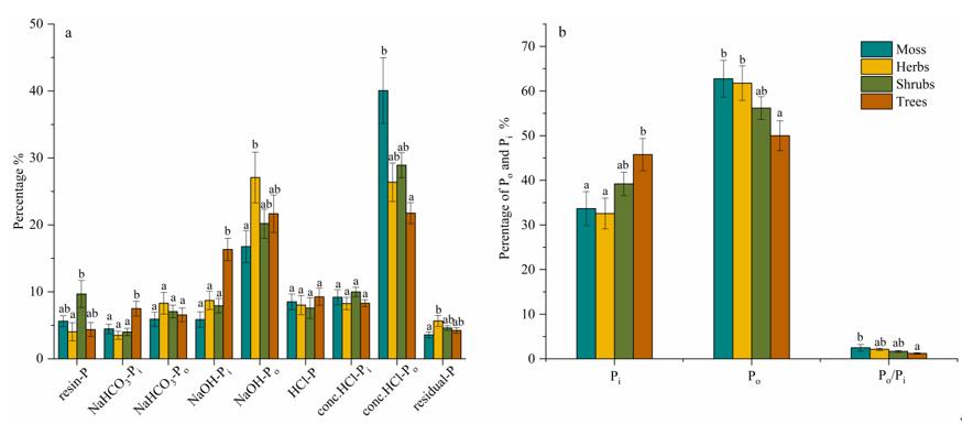 为了探究磷形态记录泥炭地植被演替历史的能力,中科院东北地理所湿地演化与生态功能学科组的科研人员在大兴安岭北部选取4种优势物种(藓类、草本、灌丛和乔木)下的表土,并钻取泥炭柱芯。探究表土中不同优势物种下磷形态的分布规律,筛选合适磷形态作为指标,同时应用到泥炭柱芯每1厘米磷形态的分布反演出植被演替历史。研究发现,虽然泥炭地中磷形态以有机磷为主,但磷在不同优势植被下的差异主要集中在无机磷形态和较为稳定的有机磷形态上,其中乔木下土壤无机磷显著高于其它植被,而藓类植被有利于土壤有机磷(尤其稳定有机磷)的赋存。