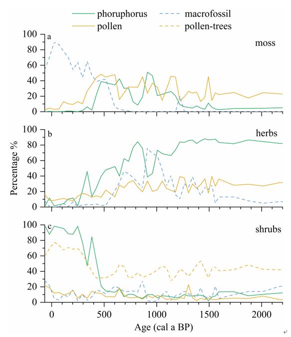 图2 磷形态重建藓类、草本和灌丛演替历史以及孢粉、植物残体记录