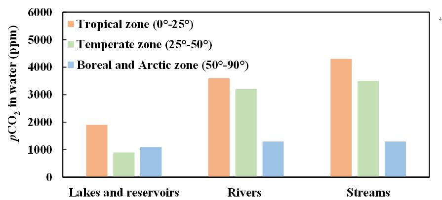 图1 不同内陆水体中pCO2分布情况,数据来源于文献Aufdenkampe, A.K. et al. Frontiers in Ecology and the Environment, 2011, 9: 53-60, doi:10.1890/100014.