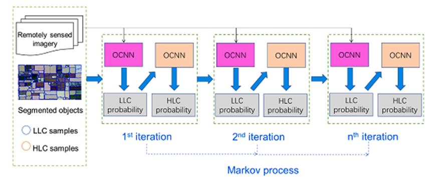 东北地理所地理信息系统学科组研究人员,针对高分影像复杂农业区作物种植结构信息提取难题,提出了一种新颖的迭代深度学习方法(Iterative Deep Learning (IDL)),在国际上首次发现并利用不同作物层次之间相关关系提高农作物遥感分类精度。IDL将作物按层级划分为高层次作物(HLC,例如粮食作物、蔬菜作物等)和低层次作物(LLC,例如玉米、大豆等),并将HLC和LLC的分类结果纳入统一的深度学习遥感分类框架。LLC作为HLC分类的条件概率,而HLC联合遥感影像作为LLC分类的条件概率,如此迭代策略构成马尔科夫链,使得LLC和HLC分类在迭代过程中协同进化、彼此修正,最终实现了LLC和HLC分类精度的共同提高。