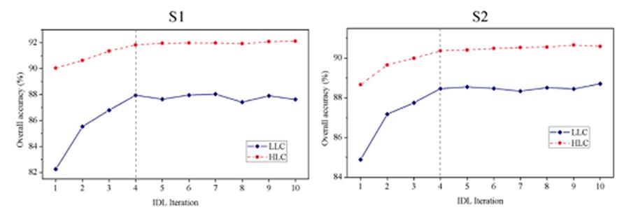 图2. 迭代深度学习中LLC和HLC分类精度随模型迭代次数增加的变化图