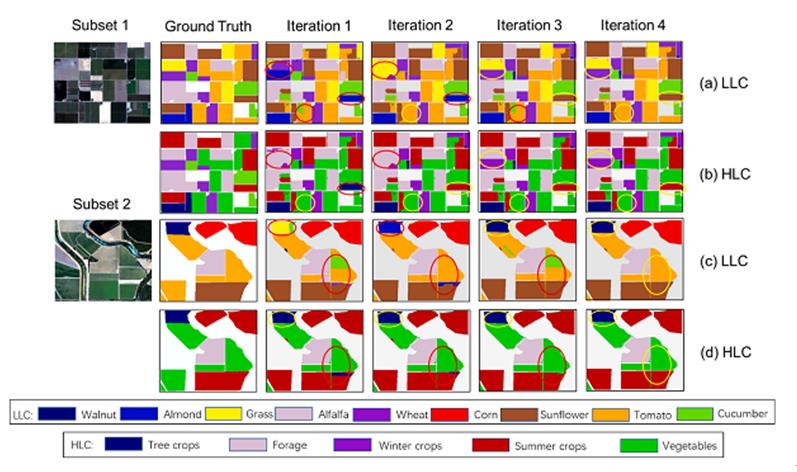 研究人员使用UAVSAR(S1)和Rapideye(S2)两种高分遥感影像对研发的IDL有效性进行了验证。研究结果表明,迭代深度学习IDL方法可同时提高LLC和HLC分类精度,且算法效率极高,仅用四次迭代LLC和HLC同时达到了最高精度。DIL生产的LLC和HLC分类精度比面向对象分类方法等优秀方法分别高4-7%和2-5%。本研究为复杂地区农作物种植结构信息的智能提取提供了全新的解决思路。