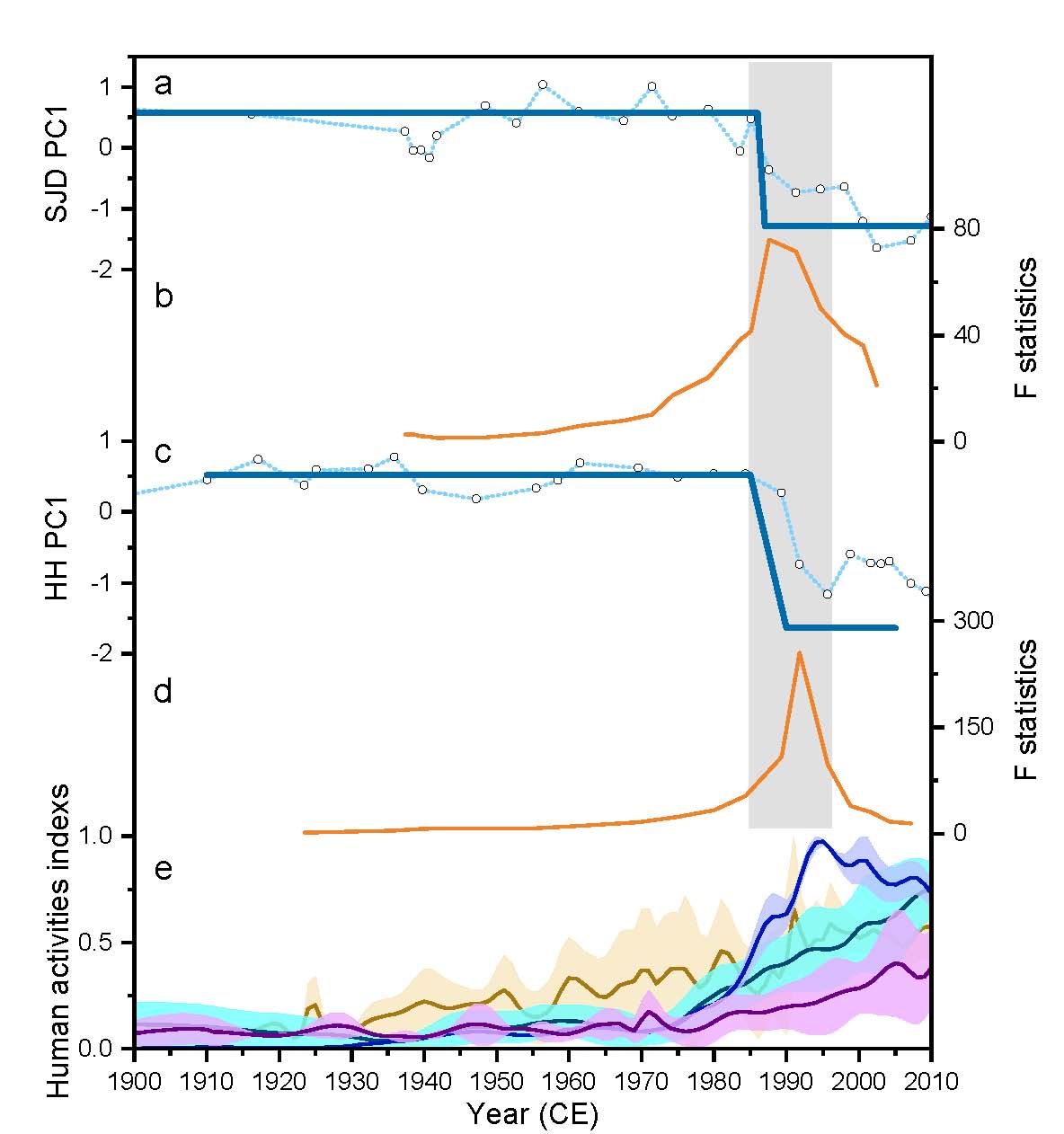 为探索是否可以利用湿地沉积记录揭示生态系统的弹性和适应性循环机制并指导制定湿地恢复目标,中国科学院东北地理与农业生态研究所湿地演化与生态功能学科组的科研人员们利用一个退化的湿地(洪河湿地)和一个在近十几年来逐渐消失的湿地(申家店湿地),选取耐受性较强的植被群落和硅藻群落等慢变量(slow variables),评估其在近百年来人类活动胁迫下表现出的弹性特征和适应性循环过程。分析发现,上个世纪70年代末,植被群落和硅藻群落在严重人类活动的干扰下逐渐从喜湿物种转变为了喜干物种。基于STARS计算和F统计等识别稳态转换早期信号的方法,发现湿地在1990年前后发生了稳态转换(图1)。湿地排干和地下水的过度使用等人类活动是造成洪河和申家店湿地发生稳态转换的主要原因。