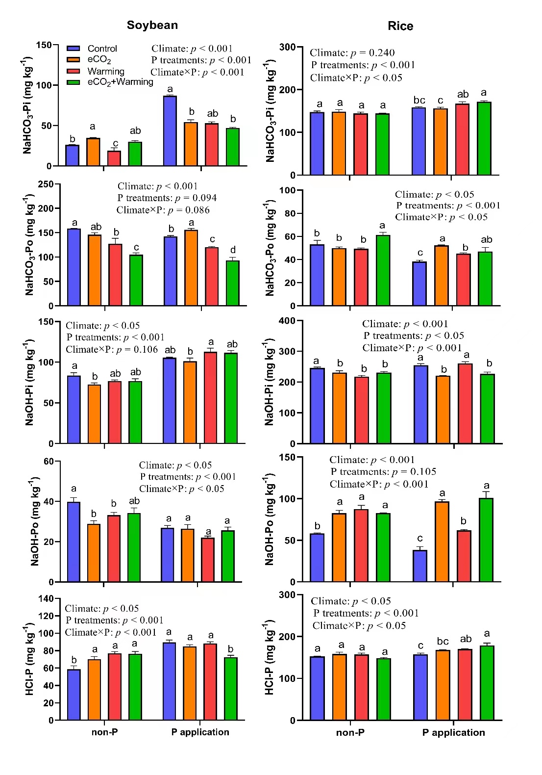 气候变化深刻影响农田生态系统养分循环。磷素(P)作为农田生态系统中第二重要的植物营养元素,能够调节作物对气候变化的适应性。因此,研究作物磷吸收和土壤磷动态对气候变化下维持农业生态系统可持续性至关重要。然而,大气CO2浓度和温度升高对作物生长和土壤磷组分的影响,以及相关微生物机制鲜有研究。