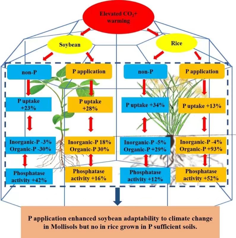 中国科学院东北地理与农业生态研究所农田分子生态学科组研究人员,利用开顶式气候室(OTC)模拟大气CO2浓度和温度升高,种植大豆和水稻在施磷肥和不施磷肥条件下作物磷吸收及根际土壤磷转化相关微生物分子生态特征。研究发现,在施磷肥和不施磷肥条件下,大气CO2浓度和温度升高分别增加大豆磷吸收23%和29%,水稻磷吸收34%和13%。因此,施磷条件下大豆磷吸收对气候变化的响应更为明显,而水稻则是在不施磷条件下更为显著。而且,大气CO2浓度和温度同时升高降低大豆根际土壤有机磷含量,却增加水稻根际土壤有机磷含量(图1)。大豆根际有机磷含量与酸性磷酸酶活性呈负相关关系,然而在水稻根际呈正相关关系。因此,气候变化影响大豆根际土壤磷转化以有机磷矿化为主,而水稻则以磷固定为主。此外,大气CO2浓度和温度同时升高增加了大豆施磷土壤磷转化相关基因丰度,如phoD(碱性磷酸酶合成基因)、phoC(酸性磷酸酶合成基因)、pstS(磷酸盐特异性转运蛋白酶)和phnX(磷酸酯酶基因),提出大豆根际有机磷的矿化是磷转化的主要生物学过程,而水稻根际土土壤磷转化主要以磷固定为主,而且根际土壤有效磷主要来自于无机磷的活化(图2)。此研究揭示了作物—土壤—微生物系统磷循环的相关机理,为气候变化条件下不同作物磷肥管理策略提供了理论基础。