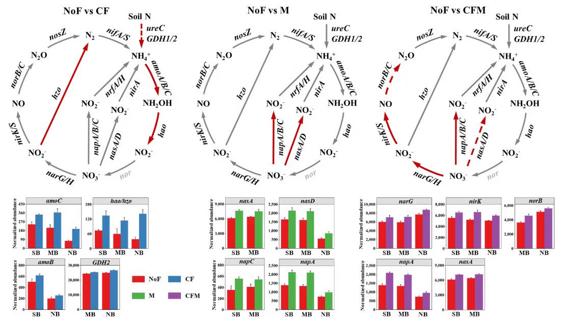 在此基础上,团队进一步利用高通量宏基因组测序技术,针对黑土农田碳氮循环功能基因进行分析。结果显示,单施有机肥或与化肥配施显著改变黑土碳氮功能基因的群落结构,增加了纤维素和果胶降解的涉碳基因丰度;而长期单施化肥显著积累了黑土氨氧化作用相关功能基因丰度,可能导致硝酸盐富集淋失及N2O排放增加(图1);同时发现长期有机肥添加显著富集同化和异化硝酸盐还原作用相关功能基因,这有助于提升黑土铵态氮含量及氮肥利用率(图2);然而,有机肥化肥配施会进一步导致黑土反硝化作用相关功能基因丰度的显著增加,表明过量氮素养分投入可造成土壤氮素通过气态形式损失的风险(图2)。该研究为推进黑土区化肥减量化,构建有机肥施用长效机制提供微生物学理论依据。