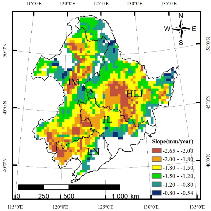 东北地区旱地农作物以雨养为主,受自然降水和蒸发等因素影响显著,土壤水分过高或过低均可能影响作物的正常生长,甚至会导致洪涝或干旱等灾害发生。目前,对于土壤表层的土壤水分监测,微波遥感能够发挥较大优势,但对于土壤深层的水分含量以遥感陆面数据同化手段获取的再分析资料为主。研究人员以GLDAS Noah模式下的1961-2010年0.25°×0.25°空间分辨率玉米根区0-200 cm土壤水分和1961-2010年中国气象数据为基础,评价了GLDAS根区范围多层土壤水分产品的时空分布特征,发现玉米根区土壤水分50年内降低了约71 mm。基于Penman-Monteith公式采用单作物系数法计算作物需水量,发现整体上玉米需水量的时空分布并无显著变化。综合土壤水分和需水量时空分布信息,评估了东北地区潜在玉米种植范围的水分适宜性区域,结果显示,东北玉米适宜区50年减少了超过6万平方公里,这一结果对农业用水管理和农业种植结构调整规划具有重要参考意义。