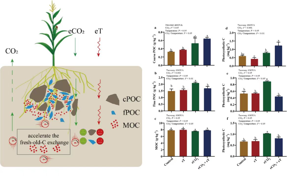 东北地理与农业生态研究所农田分子生态学科组研究人员,利用开顶式气候室(OTC)模拟大气CO2浓度和温度升高,通过稳定同位素13C示踪技术,量化出了玉米全生育期内光合碳在黑土有机碳库各组分的分配去向。研究发现,在高CO2浓度条件下,玉米的生物量并未增加,但显著提高了玉米光合碳在土壤细颗粒有机碳(fine POC)和矿质有机碳(MOC)组分中的积累;但在大气CO2浓度和温度双升高条件下,这种光合碳分配现象则消失,研究结果表明升温会促进新鲜有机碳-光合碳的分解,土壤的光合碳分配量未表现出增加趋势。连续4个生长季的大气CO2浓度和温度双升高并未增加总有机碳的积累,但会加速土壤有机碳的周转速率(图1),该研究为气候变化影响黑土农田土壤碳循环提供理论支撑。