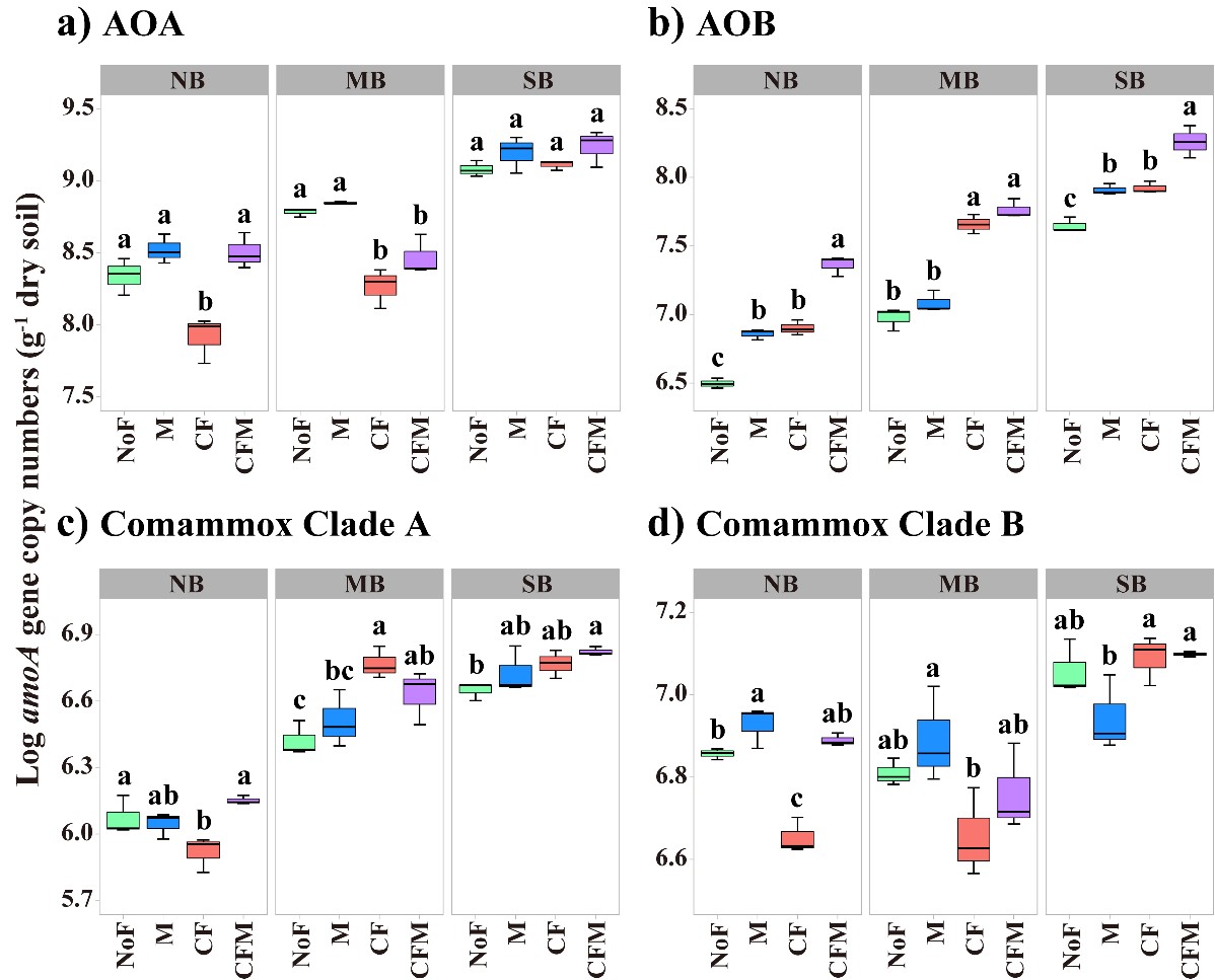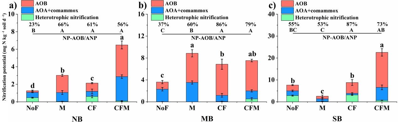 土壤氨氧化也称为硝化,分为自养和异养两个过程。自养微生物的氨氧化细菌(AOB)、氨氧化古菌(AOA)和全程氨氧化细菌(Comammox)共同驱动土壤铵态氮向硝态氮转化,但三类氨氧化微生物的相对贡献因土壤环境变化存在较大差异。东北黑土农田土壤氮素含量相对较高,但氮肥的利用效率不高,为控制铵态氮向硝态氮转化及提高肥料利用率,解析氨氧化微生物介导的黑土农田硝化作用具有重要的实践意义。为此,东北地理所的科研人员联合黑龙江省农科院土肥所、黑河分院及吉林省农科院研究团队,利用位于黑河(NB)、民主乡(MB)和公主岭(SB)的三个30余年的黑土野外定位施肥平台,研究了长期化肥与有机肥不同施用方式下的土壤氨氧化微生物丰度、活性和相对硝化贡献的变化情况。