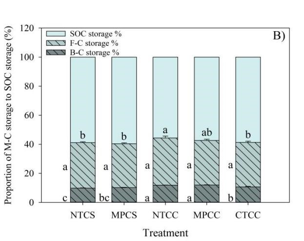 图2 a)微生物残体碳、真菌残体碳以及细菌残体碳储量;b)微生物残体碳、真菌残体碳以及细菌残体碳储量与总有机碳储量比例