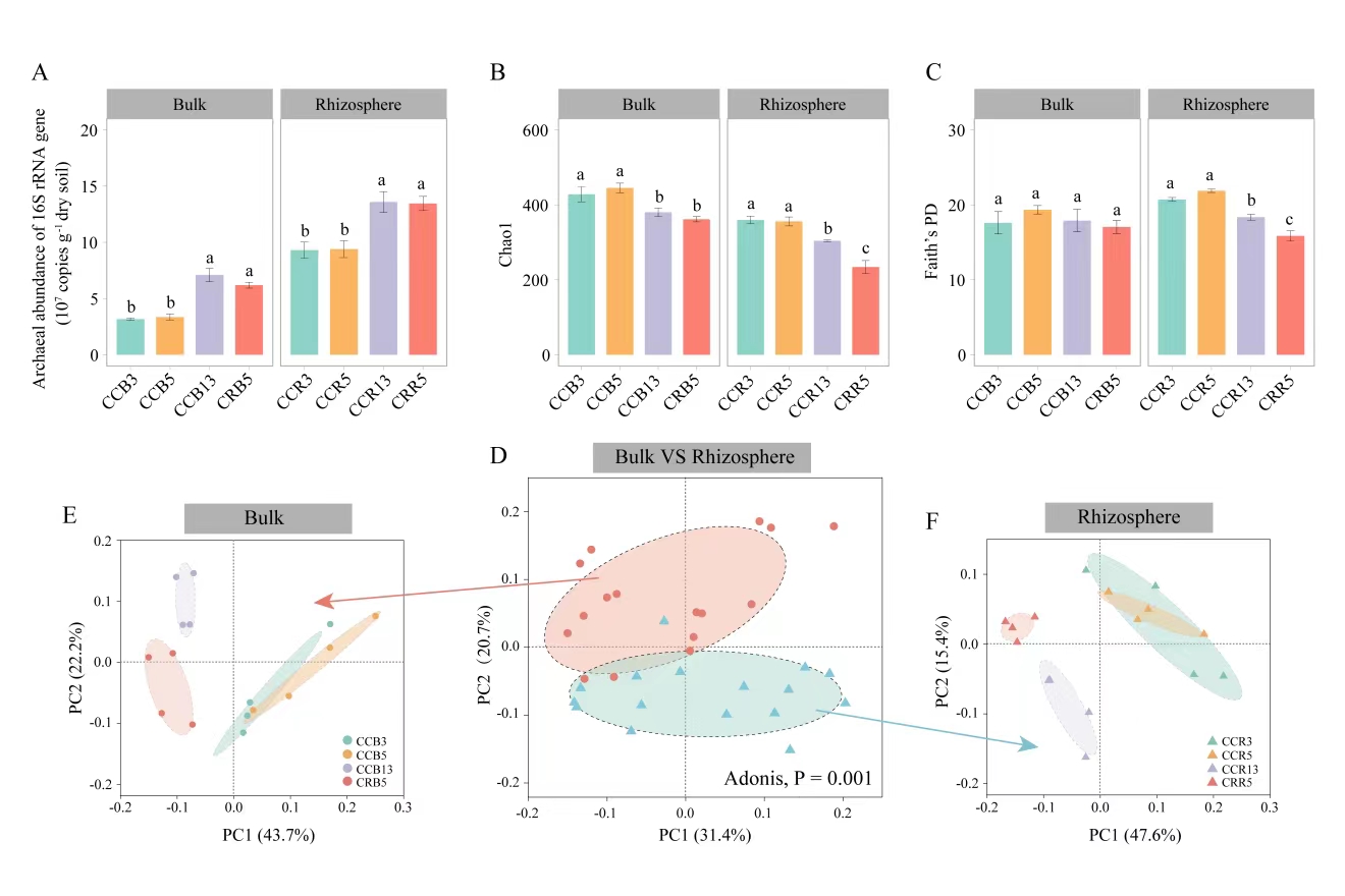为此,东北地理所农田分子生态学科组科研人员基于大豆短期连作(3年和5年)、长期连作(13年)及大豆-玉米轮作处理,采用高通量测序技术系统研究了根际和非根际土壤古菌群落的丰度、多样性和组成特征,结合细菌和真菌群落对微生物网络结构和微生物抗性进行综合分析,以阐明连作下土壤微生物群落变化与作物产量间的互作关系。