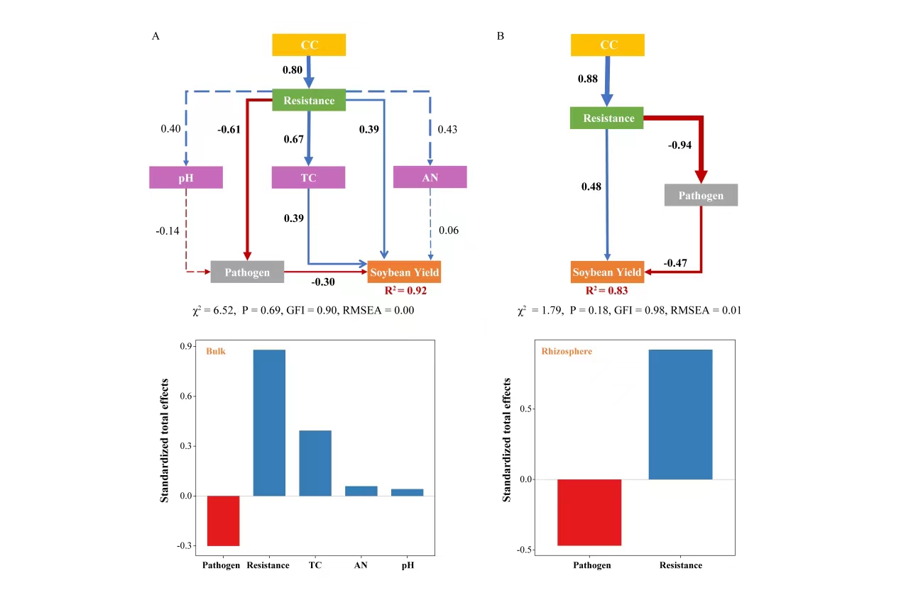 图2土壤微生物抗性指数对土壤养分、潜在植物病原菌丰度和大豆产量的影响
