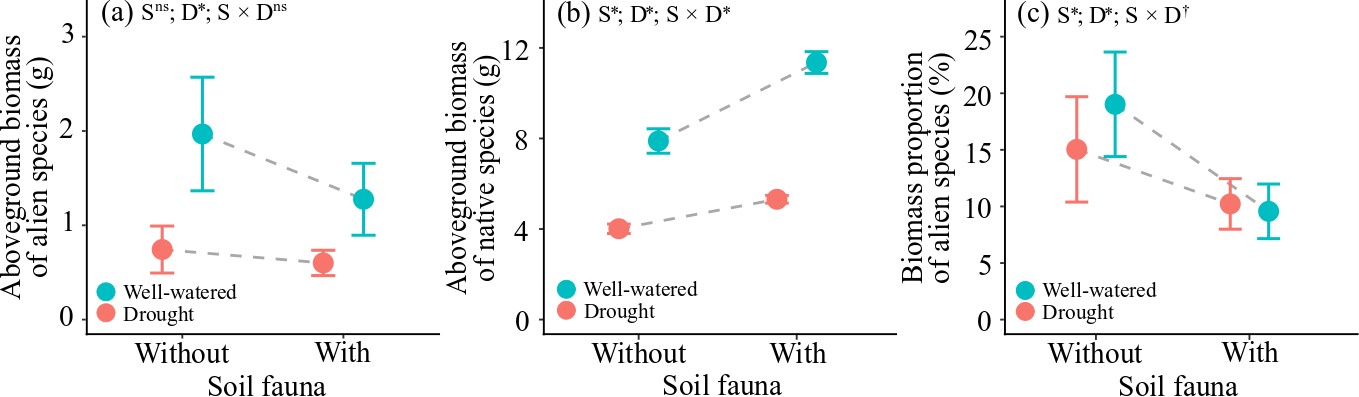 作为生态系统的重要限制性环境因子,土壤养分和水分变化可能会影响植物入侵过程。与养分富集促进外来植物入侵的普遍共识不同,干旱对外来植物入侵影响的研究相对缺乏、且研究发现存在分歧。原因之一可能是部分控制实验只考虑了干旱对外来植物入侵直接效应,并未考虑外来/本地植物与其他生物类群的互作过程。已有研究证实中型土壤动物会影响植物之间的竞争、且对土壤水分变化的响应敏感。因此,理论上中型土壤动物存在与否会影响干旱情景下的植物入侵过程。但是,目前对该问题尚缺乏明确的实验论证。