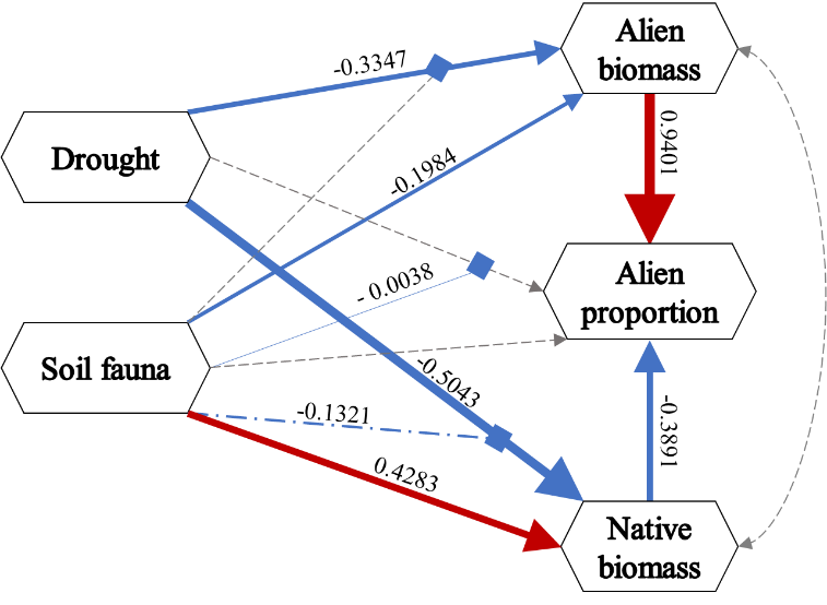 图3 结构方程模型(SEM)显示了干旱、土壤动物及其相互作用对外来目标植物、本地植物群落生物量以及外来目标植物在群落中的生物量比例