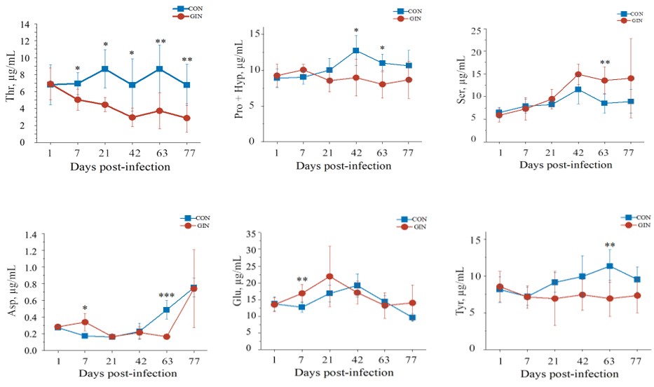 图1 Haemonchus contortus感染对宿主羔羊血浆氨基酸浓度的影响(部分)