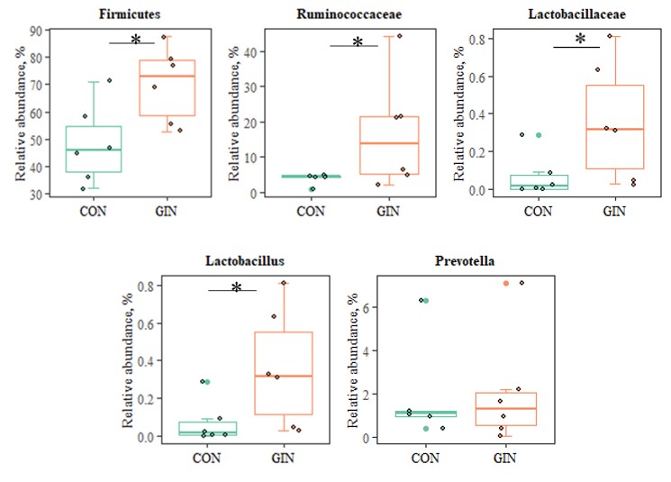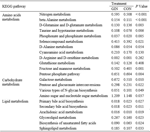 为此,中国科学院东北地理与农业生态研究所草地农牧业学科组成员研究了H. contortus感染对宿主羔羊蛋白质消化、氨基酸代谢、胃肠道微生物组成的影响。研究发现:H. contoutus 感染降低了羔羊采食量和日粮营养物质的表观消化率(尤其是日粮中蛋白质和脂质的表观消化率),并降低了羔羊的生长性能。羔羊蛋白质吸收受到影响,瘤胃胃蛋白酶和回肠胰蛋白酶活性显著降低,血浆氨基酸谱变化显著。例如,宿主羔羊血浆中苏氨酸和脯氨酸浓度显著下降,血浆中天冬氨酸、谷氨酸、丝氨酸和酪氨酸浓度显著增加,从而弥补由于H. contortus 定植、发育和繁殖造成的宿主羊蛋白质和氨基酸损失(图1)。感染H. contortus的羔羊的生理代谢和血液生化指标的改变与胃肠道微生物群落组成密切相关。与未感染羊相比,感染羊胃肠道中与碳水化合物、蛋白水解相关的菌属丰度显著增加,例如Firmicutes、Ruminococcoceae、Lactobacillaceae、Lactobacillus以及Prevotella等(图2), 并且羔羊胃肠道中与蛋白质、碳水化合物以及脂肪等营养物质代谢相关的KEGG通路均显著增加(表1)。本研究结果为系统解析GINs感染和寄生与宿主羊营养代谢的关系提供了理论依据。