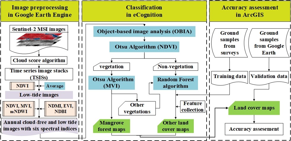 针对以上困难,中国科学院东北地理所地理景观遥感学科组研究人员,基于28,323景Sentinel-2影像构建了2016-2020年高质量(无云低潮)逐年影像数据集。集成OTSU图像自适应分割阈值算法、随机森林算法(RF)和面向对象方法(OBIA),提出了一种高效、高精度的红树林及其周边土地覆盖类型自动提取方法。基于此方法构建了2016-2020年中国国家级自然保护区内的红树林与其周边土地覆盖类型的逐年空间分布数据集,解析了红树林空间分布格局年际变化及其转化。