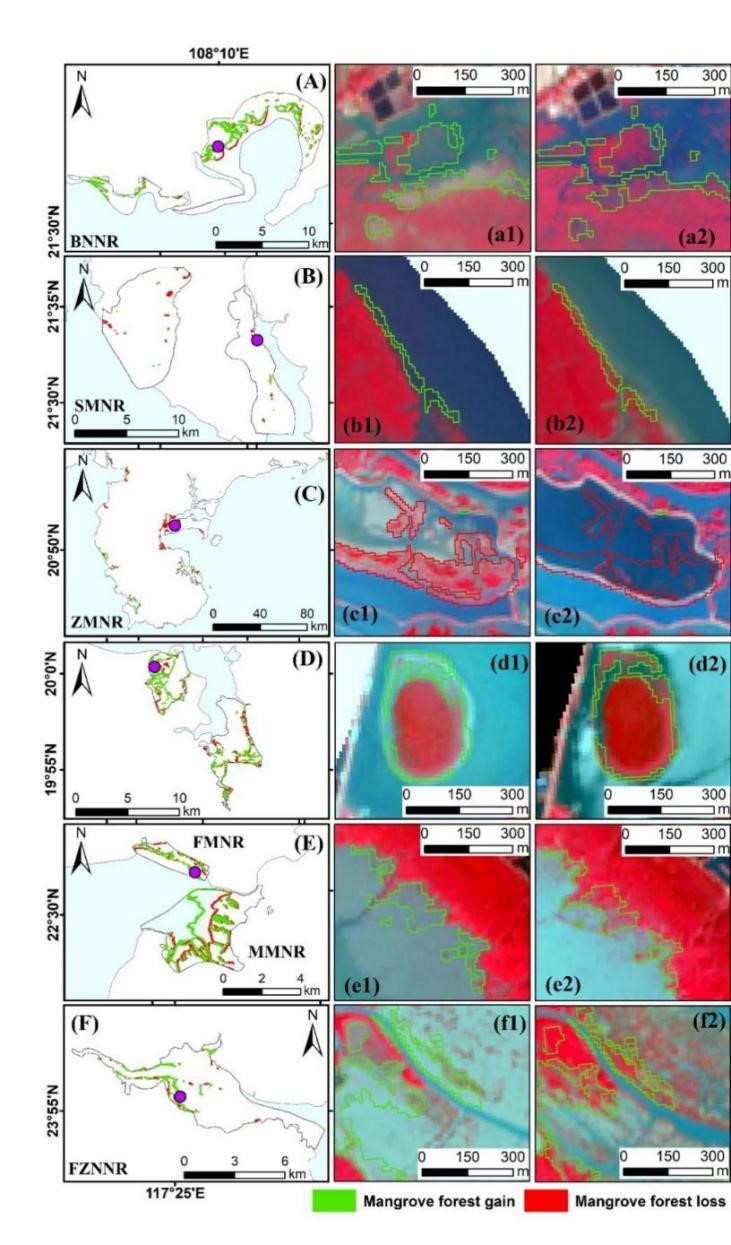 (A-E:2016-2020年保护区红树林总体变化,a1-f1,a2-f2分别为2016和2020年各保护区内典型红树林变化)