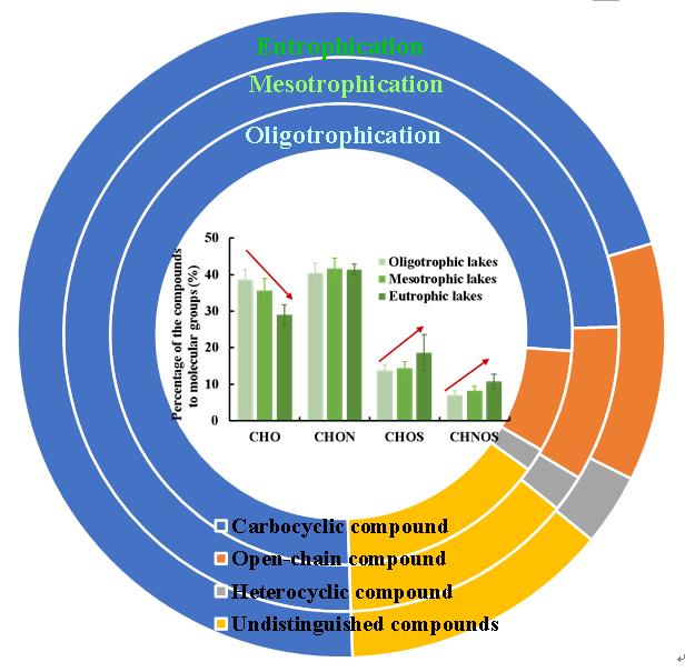 结果表明,富营养化使水体DOM分子构成中的CHO%含量减少,含硫元素的杂原子化合物(CHOS%和CHNOS%)含量增加;富营养化湖泊中夏季水体DOM的分子稳定性要高于秋季,这与浮游植物群落的季节性演替有关;富营养化水体中,DOM的主要组分为高度不饱和化合物为主、O3S+O5S化合物和富羧基脂环化合物(CRAMs),这是内源DOM(浮游植物衍生)被进一步生物转化的产物,湖泊富营养化可能会导致水体中难降解DOM化合物逐渐增多。目前全球范围内水体富营养化现象逐渐加剧,本研究结果为阐明湖泊DOM在未来全球碳循环中的作用提供了重要的理论支撑。