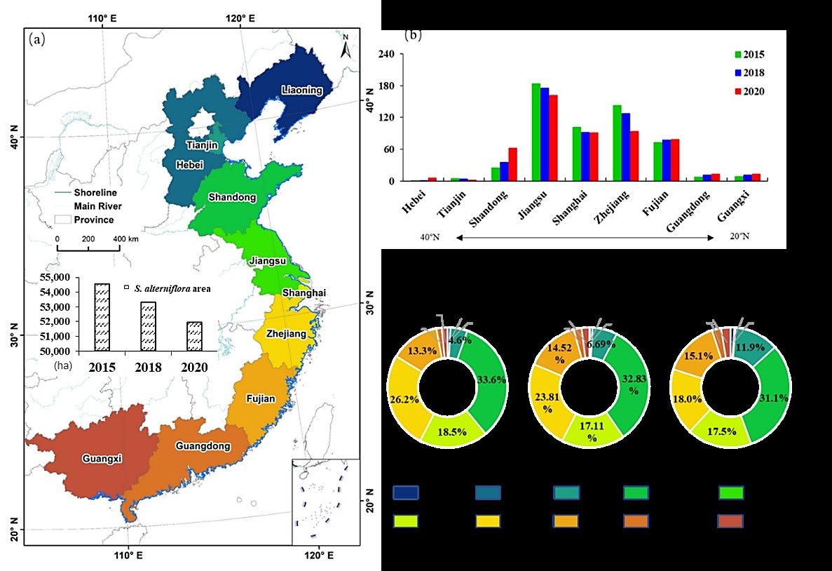 图1. 2015、2018和2020年中国沿海省份互花草入侵情况(a)、各省互花米草面积变化(c)、各省互花米草占比
