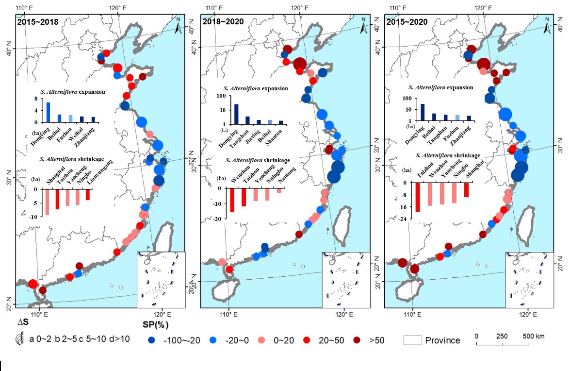 中科院东北地理所地理景观遥感学科组研究人员,基于遥感大数据和地面调查样点,应用已研发的集成面向对象和支持向量机的互花米草分布信息提取方法,获取了2015(SDGs元年)、2018和2020年(相关SDGs完成年)中国滨海互花米草分布数据集及入侵土地覆被类型数据集;在国家、省域及热点城市三个尺度上解析了2015-2020年中国滨海互花米草的时空变化特征;评估了面向SDGs的中国互花米草治理成效及存在问题。