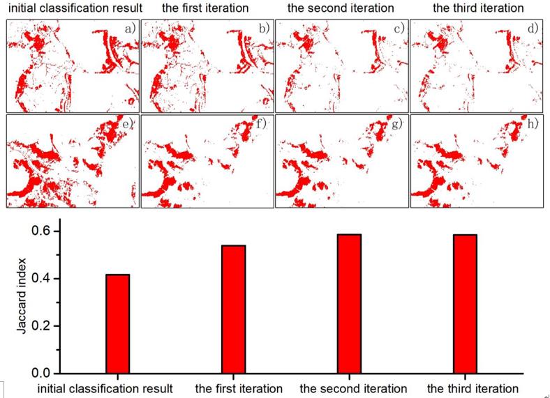针对上述问题,东北地理所地理景观遥感学科组研究人员受二分类算法机理启发,在正样本固定的前提下,通过迭代优化负样本不断改进决策面,提出了一种决策面优化方法。这一方法能够在不引入新的正样本情况下,通过迭代方式获取新的误分类样本,从而压制误分类斑块、减轻样本获取压力,首次完成了中国国家尺度外来红树植物无瓣海桑遥感提取。