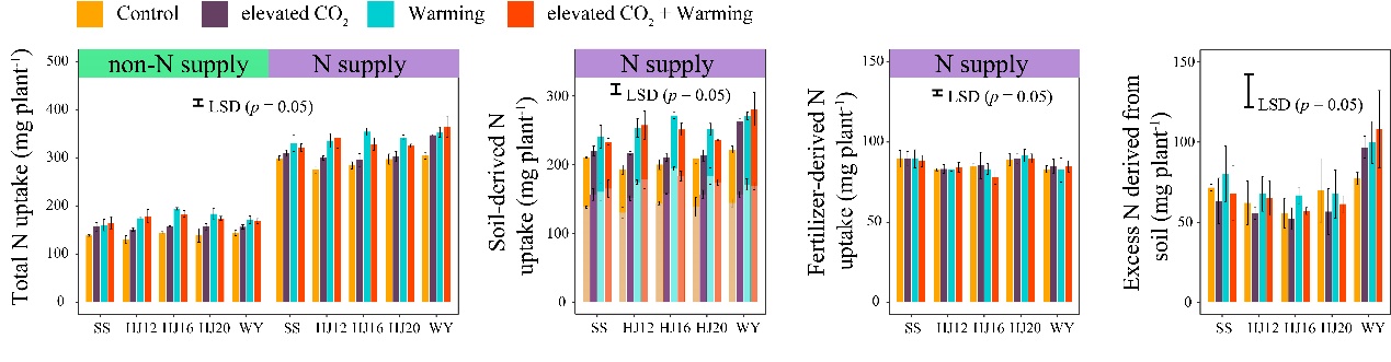 图2 大气CO2浓度和温度升高条件下,5个品种水稻的总氮吸收以及来源土壤和肥料的氮吸收