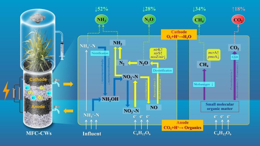 该研究从全新的视角诠释了微生物燃料电池耦合人工湿地系统的工作机制与功能,研究成果为同步实现人工湿地高效水质净化和多种碳氮气体减排提供了新的思路,将为“双碳”战略目标需求背景下低排放型人工湿地的设计提供重要的理论依据和技术支持。