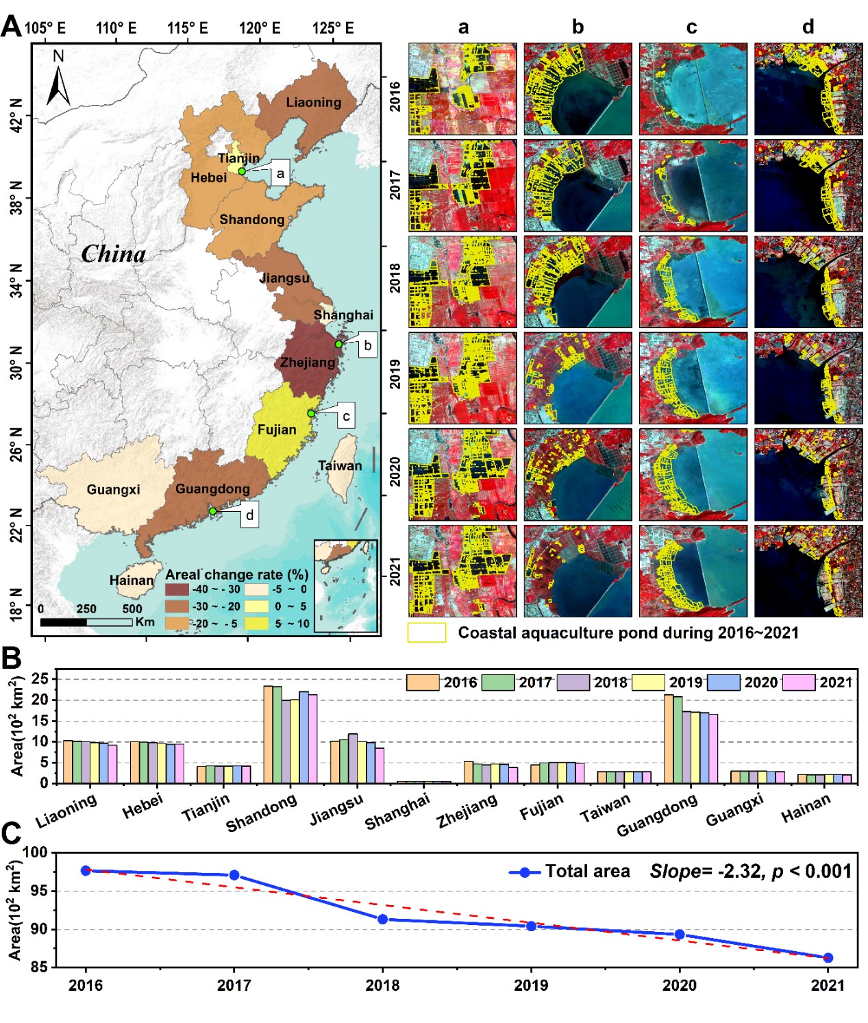 滨海养殖池的快速扩张与国家食物安全与沿海地区社会经济发展密切相关,但也引发了一系列的生态问题,如滨海天然湿地损失与退化、水鸟自然栖息地大量丧失、沿海区域的水体污染及富营养化等。精准监测与科学评估中国滨海养殖池空间分布的时空动态,对于支撑近海生态系统可持续管理与保护等具有重要的科学意义和现实意义。然而,作为拥有世界最大规模滨海养殖面积的中国,尚缺乏国家尺度、精准的滨海养殖池空间分布逐年动态数据集;尤其是在滨海湿地保护与恢复背景下,2015年以来滨海养殖池的时空变化评估相对匮乏。
