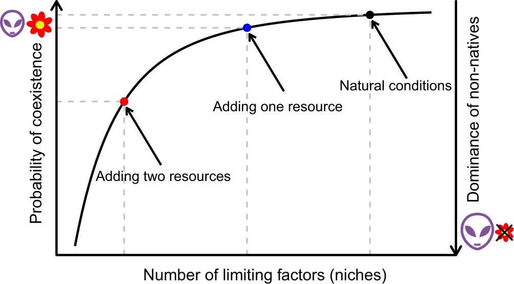 图1 限制因素数量对物种共存和生物入侵影响的示意图。自然条件下,限制因素(生态位)多,从而促进共存。资源添加会减少限制因素的数量,从而抑制共存,并促进外来物种的入侵。