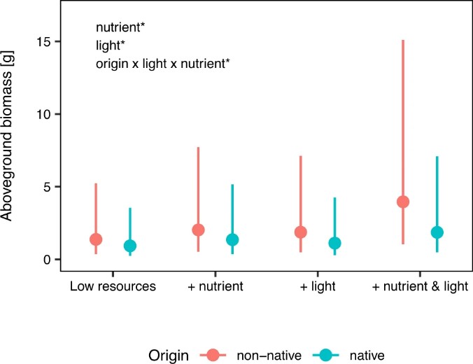 两个实验同时发现:在低资源(近似自然条件)或添加一种资源的情境下,外来植物并未比本地植物产生更多的地上生物量(即竞争力相似)。然而,当同时添加养分和光照资源时,外来植物比本地植物更具竞争力(图2)。该研究结果支持我们提出的假说:多种资源的添加可以极大地减少生态位维度(即限制因素的数量)进而增强外来植物的竞争优势。因此,未来经历多种全球变化影响的栖息地可能会更容易被外来植物入侵。