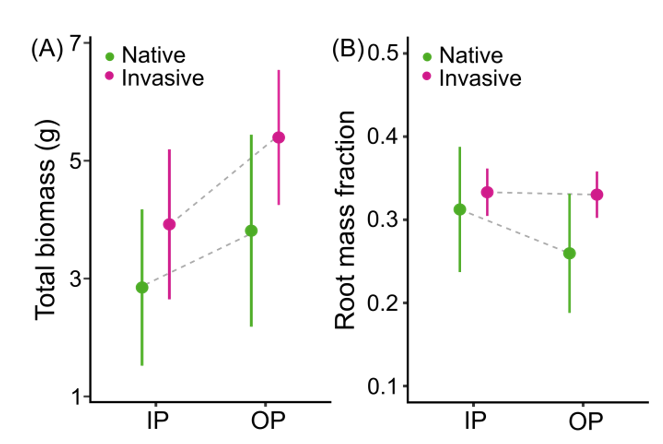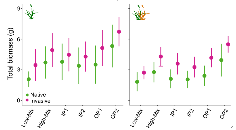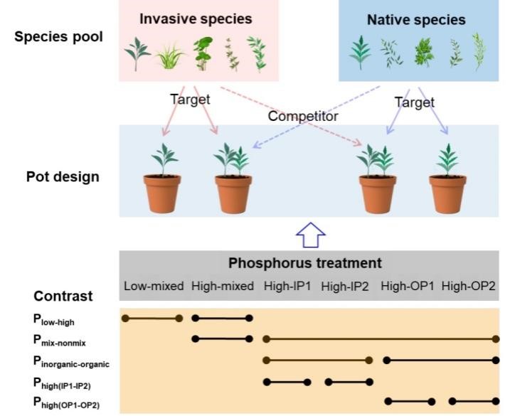 基于以上研究背景,中科院东北地理所生物入侵生态学团队与安徽农业大学资源与环境学院生态学团队合作,将5对同属的外来入侵植物与本地植物单独种植以及相互竞争种植在一起,并施加以下6种不同的土壤磷处理(图1):1、低可利用性水平混合磷处理(low-mixed);2、高可利用性水平混合磷处理(high-mixed);3、高可利用性水平磷酸氢钙处理(IP1);4、高可利用性水平磷酸铝处理(IP2);5、高可利用性水平植酸处理(OP1);6、高可利用性水平磷酸腺苷二钠盐处理(OP2)。实验结束之后,测定植物的地上地下生物量,对比研究入侵植物与本地植物对不同可利用性水平与不同形态土壤磷的响应差异。