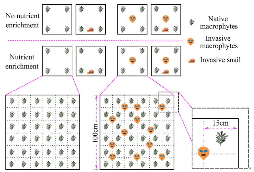 针对以上研究空白,中科院东北地理所生物入侵生态学团队与中科院亚热带所洞庭湖站研究人员共同合作实施了一个中宇宙实验,探究水体富营养化如何影响外来动物福寿螺与外来水生植物粉绿狐尾藻的共同入侵以及三者如何交互影响本地植物群落。实验设计如图1所示:对由三种水生植物组成的本地群落分别施加入侵动物福寿螺(有采食vs无采食)、入侵植物粉绿狐尾藻(有植物入侵vs无植物入侵)和养分富集(是与否)的全因子处理。