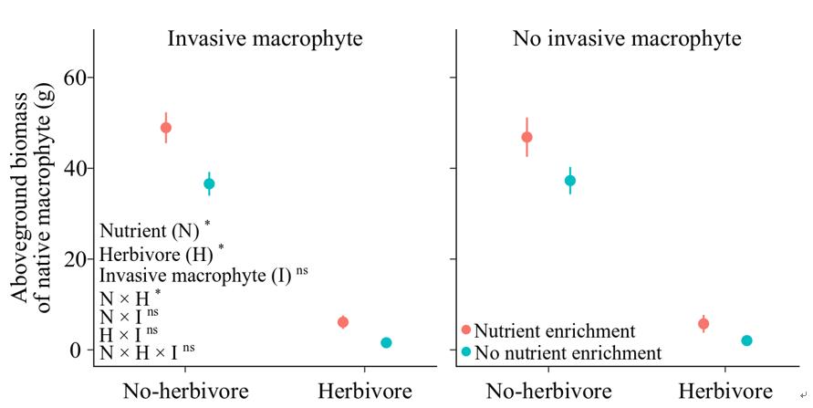 (1)富营养化显著增加了本地植物群落的地上生物量,但不影响入侵植物粉绿狐尾藻的地上生物量(图2)。因此,养分富集降低了群落中入侵植物粉绿狐尾藻的生物量占比(图3b)。