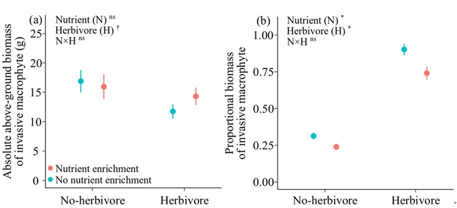 人类活动和全球气候变化的加剧导致许多生态系统经历着外来植物与外来动物的同时入侵。 “入侵崩溃假说”(Invasional meltdown hypothesis)认为,多种外来生物在入侵同一生态系统时会相互促进彼此的入侵进程,加剧对本地群落的负面影响。尽管该假说得到了许多实证研究的支持,但对于水生生态系统中来自同一产地的外来植物与外来植食性动物的协同入侵机制仍缺乏足够关注。因协同进化历史的差异,外来植食性动物对与其同一原产地的外来植物产生的负面影响要弱于对本地植物产生的负面影响。因此,似然竞争(Apparent competition)可能会调控两者的协同入侵过程。另外,除生物入侵外,水体富营养化也成为威胁淡水生态系统健康的重要环境问题,其是否会与生物入侵互作影响本地群落也有待明确。