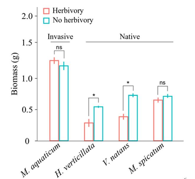 图4福寿螺取食对外来植物(粉绿狐尾藻)和本地植物(黑藻、苦草、穗状狐尾藻)生物量的影响