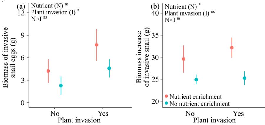 (4)福寿螺生长与繁殖的记录数据表明,入侵植物粉绿狐尾藻的存在极大地提高了入侵动物福寿螺的产卵量(图5a);并且,富营养化导致入侵动物福寿螺的生物量显著增加(图5b)。