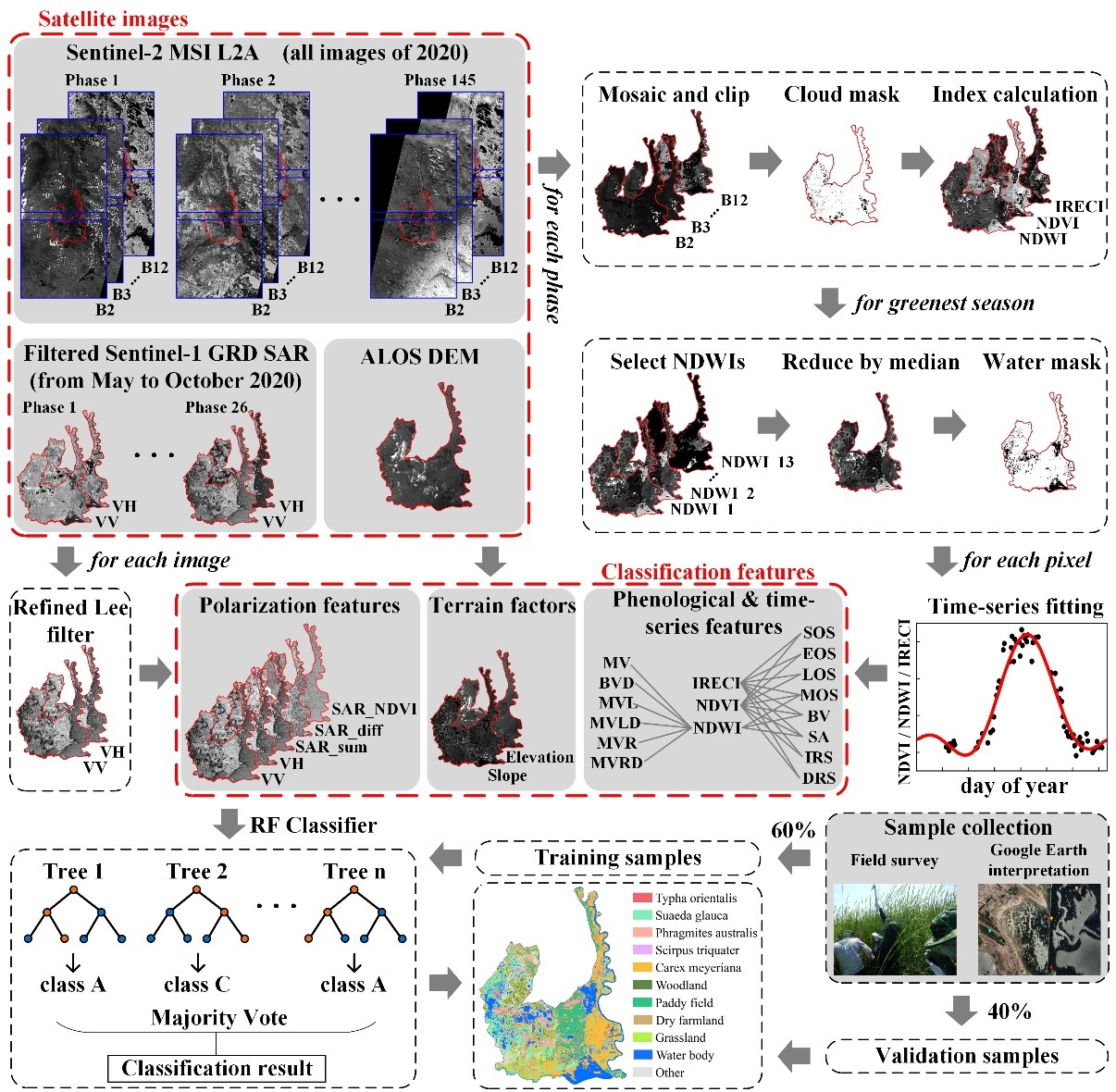 湿地是最具生物多样性的生态系统。植物群落是湿地的基本单元,也是湿地能够提供诸多生态系统功能与服务和保护生物多样性等的重要基础。因此,准确的植物群落空间分布信息对于湿地的健康评估和可持续生境管理至关重要。然而,受湿地环境的动态性和复杂性、湿地植物光谱的相似性以及遥感影像云(阴影)噪声像素等因素的限制,实现基于遥感技术的湿地植物群落精细分类十分困难,这已成为影响湿地精细管理的制约因素之一。因此,迫切需要开发有效的湿地植物群落分类方法。