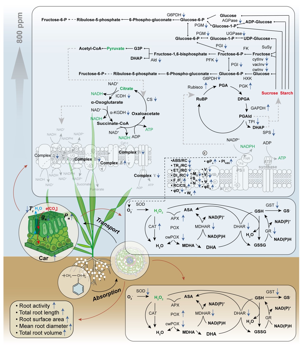 图1. 大麦响应纳米塑料和大气CO2浓度升高的生理响应机制