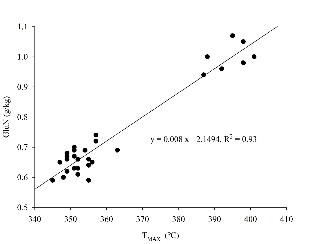 中科院东北地理所黑土有机碳与保护性耕作学科组科研人员依托保护性耕作长期定位实验(建于2001年)在国内首次开展了相关研究,包含免耕玉米-大豆轮作(NTCS)、秋翻玉米-大豆轮作(MPCS)、免耕玉米连作(NTCC)、秋翻玉米连作(MPCC)、常规耕作玉米连作且秸秆不还田(CTCC)5个处理。采集了不同深度的土壤样品,测定其土壤热稳定性(图1),计算RE相关指标,同时与土壤异养呼吸及微生物残体进行相关分析。RE方法分为热解和氧化两个阶段包括S1-S5五个阶段,具有多个相关指标,TMAX(℃)代表在S2热解阶段释放的富氢化合物达到峰值时对应的温度,可作为指示土壤有机碳成熟度的指标。HI表示在土壤有机碳中富氢化合物的相对含量,OIRE6表示在土壤有机碳在S3阶段释放的O2相对含量,代表土壤有机碳的相对氧化状态。T50代表在氧化阶段(S4)释放的CO2达到该部分总释放值50%时的温度,用来表征稳定性碳库。研究结果表明,耕作方式对RE指标影响很大(TMAX、HI、T50),但是作物轮作对其无显著影响,其中免耕显著提高了土壤表层的有机碳热稳定性(TMAX)。RE指标(HI)在短期室内培养实验中(<100天)可以很好地表征土壤异养呼吸情况,也在国际上首次发现TMAX指标与真菌残体(GluN)有很高的相关性(R2=0.93)(图2)。本项研究为未来RE方法在国际上的推广应用提供了有效的数据支撑。