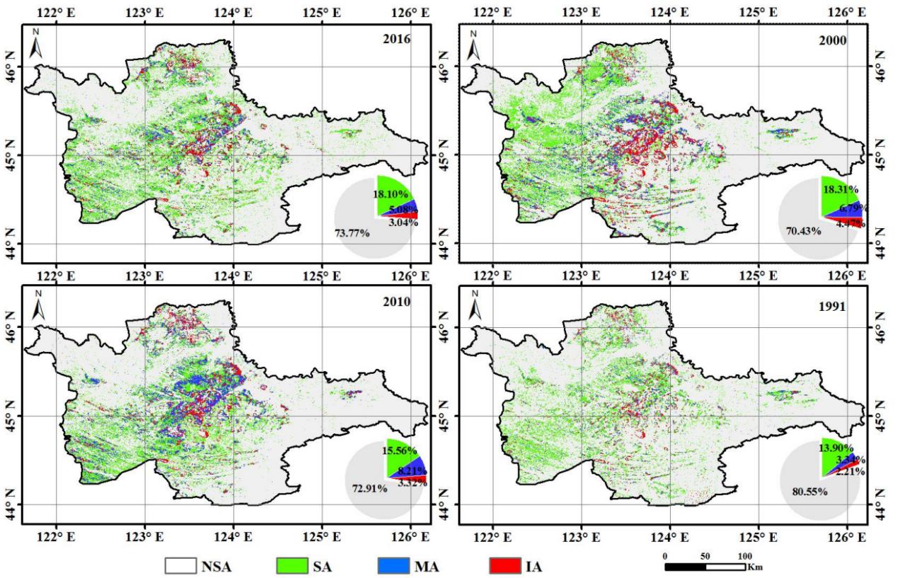 图1 1991-2016年吉林省西部土壤盐渍化等级空间分布图(NSA:非盐渍化区,SA:轻度盐渍化区,MA:中度盐渍化区,IA:重度盐渍化区)