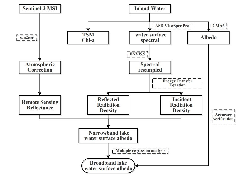 湖泊反照率反应了水体表面对太阳辐射的反射能力,是影响热通量的重要的指示参数。充分认识湖泊反照率的变化机理,对于研究干旱、半干旱区的水气相互作用特征,改进干旱区水面过程参数化方案,改善对上层湖泊温度的模拟,研究全球陆地能量和水汽循环具有十分重要的现实意义。然而,以往水体反照率的研究对象多为海洋水体,对内陆湖泊水体的研究较少,且目前大多数全球气候模式(GCMs)仍然使用固定值来表示湖泊反照率,导致模式中水体反照率与实际观测值不相关或负相关的情况出现。内陆湖泊悬浮颗粒物含量复杂多样,富营养化水平差异显著,因此其反照率更加难以精确估算,这已成为制约湖泊辐射能量平衡定量研究的瓶颈。因此,迫切需要开发湖泊反照率反演模型,揭示湖泊反照率变化的主导因素。