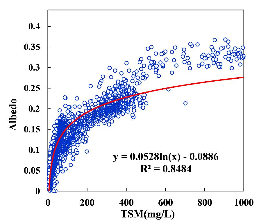 不同水质因子中,悬浮物浓度(TSM)的大小是影响湖泊反照率空间分布的主导因子。TSM和Albedo的总体相关性达到了0.85.且在低浓度时表现出强相关性,而叶绿素-a浓度(Chl-a)和Albedo的相关性较低,为0.47.