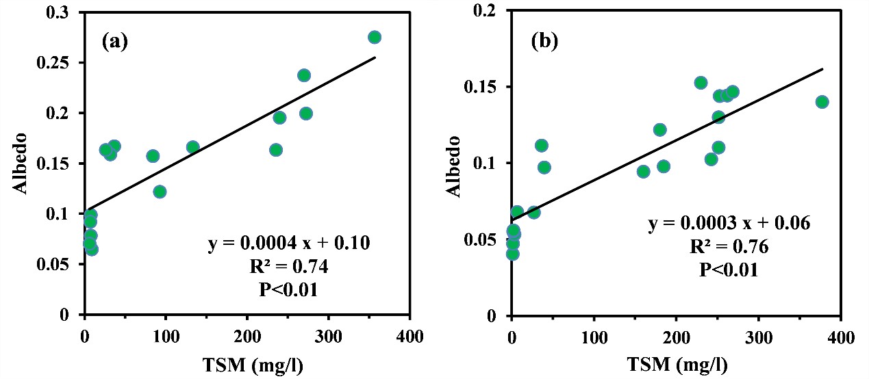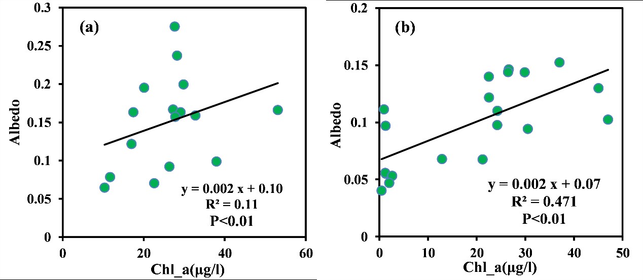 影响因素方面:①太阳高度角是湖泊反照率变化的首要控制因子。湖泊反照率随着太阳高度角增大而降低;② 在不同太阳高度角区间内,湖泊反照率值均呈现随悬浮物浓度升高而增大的趋势。对于总悬浮物中无机颗粒物占主导的水体,其内部反射的散射辐射量主要由水体内的无机悬浮物含量决定,而后者能将部分透射进入水体中的太阳短波辐射经后向散射重新返回大气。③ 湖泊反照率和叶绿素a浓度(Chl-a)在低太阳高度角时无明显相关性。在高太阳高度角时,反照率呈现随Chl-a浓度升高而升高的正相关关系,但相较于悬浮物浓度对湖泊反照率大小的贡献程度,Chl-a浓度要小得多。④ 风浪通过影响浅水湖泊悬浮物浓度从而间接影响湖泊反照率。⑤ CDOM和颗粒物吸收在较短波长具有强吸收作用,影响入射太阳辐射的分配及其光谱分布。但并无足够证据表明CDOM和颗粒物吸收会使湖泊反照率降低,本研究区内湖泊反照率的变化主要取决于无机颗粒物的后向散射特性。