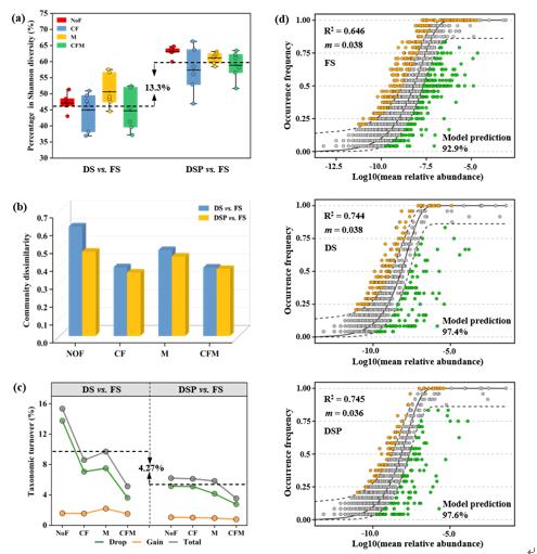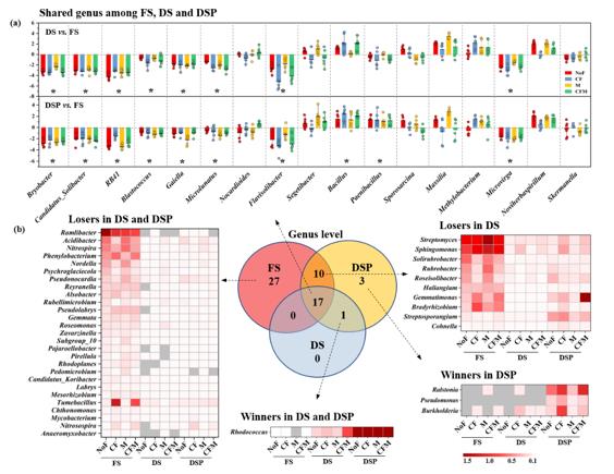 结果表明,长期干燥保存对土壤细菌多样性和群落结构产生显著影响,自然风干土壤中细菌群落多样性是冻存土的46.8%,而去除relic DNA后的风干土壤细菌多样性恢复了13.3%且明显减小了与冻存土细菌群落结构的差异(图1)。风干土壤保存了超过90%序列数的细菌门,但在属水平上细菌对干燥压力产生差异性应对策略(图2)。尽管如此,土壤干燥保存没有显著改变长期施肥对土壤细菌多样性、群落结构和群落抗性影响的遗留效应,即长期化肥添加显著改变了细菌群落结构且降低了细菌群落多样性。此外,土壤干燥保存减弱了细菌共线性网络结构的稳定性,但去除relic DNA后的风干土壤明显恢复了微生物网络特性。该研究提出了利用PMA核酸染料去除土壤中relic DNA的方法可改善长期干燥保存对土壤微生物群落的负面影响,同时施肥对土壤细菌的遗留效应在保存长达7年的风干土壤中仍可检测到,表明长期保存的历史土壤样品或可用于不同农业管理下土壤微生物分子生态学研究。